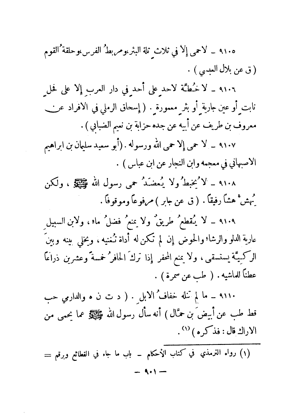 9105- لا حمى إلا في ثلاث ثلة البئر، ومربط الفرس، وحلقة القوم. "ق" عن بلال العبسي.