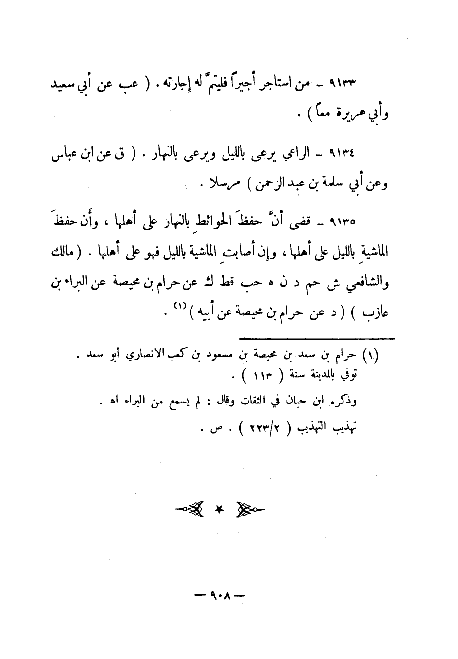 9135- قضى أن حفظ الحوائط بالنهار على أهلها، وأن حفظ الماشية بالليل على أهلها، وإن أصابت الماشية بالليل فهو على أهلها. مالك والشافعي "ش حم د ن هـ حب قط ك" عن حرام بن محيصة عن البراء بن عازب "د" عن حرام بن محيصة عن أبيه1.