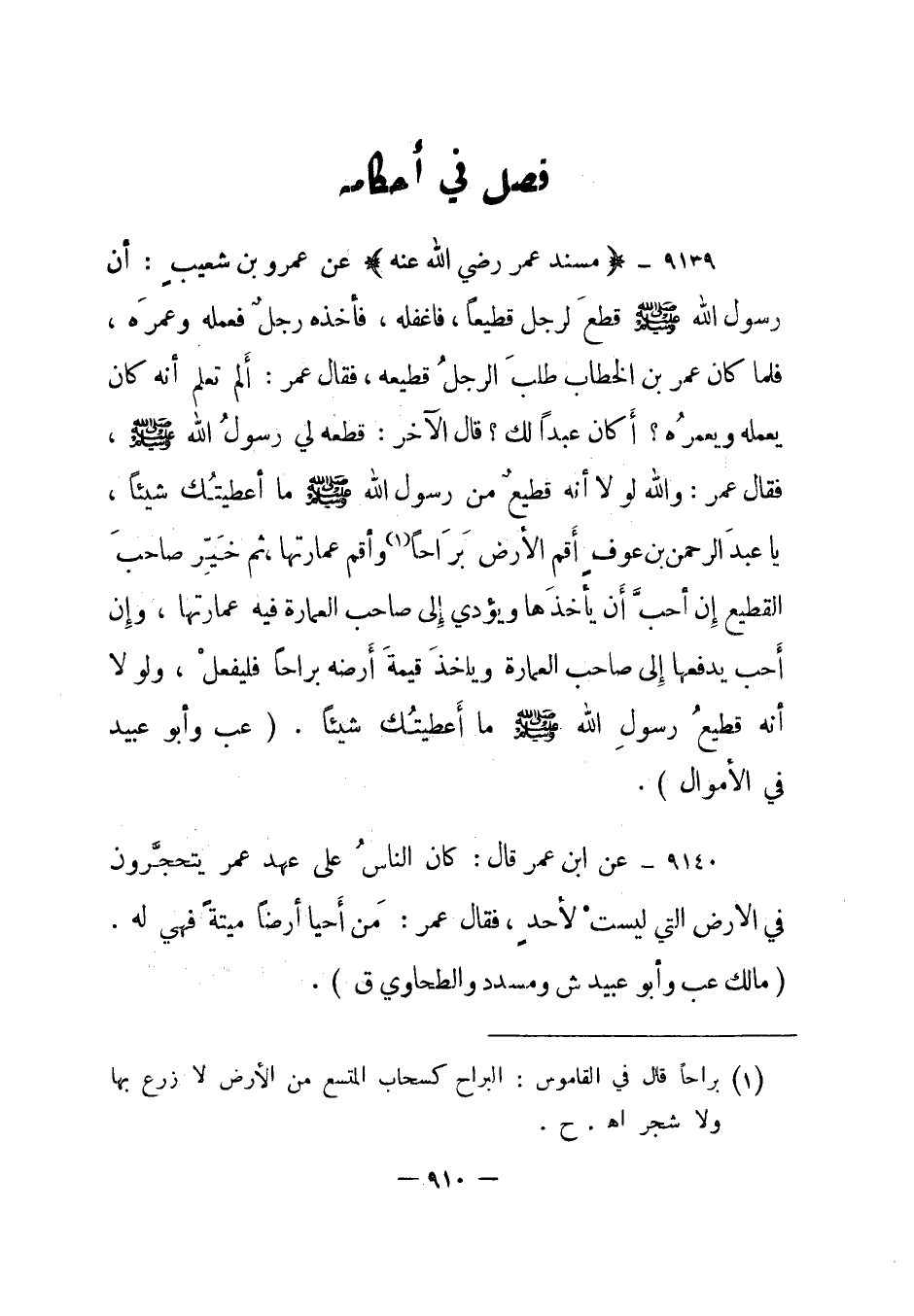 9139- "مسند عمر رضي الله عنه" عن عمرو بن شعيب: أن رسول الله صلى الله عليه وسلم قطع لرجل قطيعا، فأغفله، فأخذه رجل فعمله وعمره، فلما كان عمر بن الخطاب طلب الرجل قطيعه، فقال عمر: ألم تعلم أنه كان يعمله ويعمره؟ أكان عبدا لك؟ قال الآخر: قطعه لي رسول الله صلى الله عليه وسلم، فقال عمر: والله لولا أنه قطيع من رسول الله صلى الله عليه وسلم ما أعطيتك شيئا، يا عبد الرحمن بن عوف أقم الأرض براحا1 وأقم عمارتها، ثم خير صاحب القطيع إن أحب أن يأخذها ويؤدي إلى صاحب العمارة فيه عمارتها، وإن أحب يدفعها إلى صاحب العمارة ويأخذ قيمة أرضه براحا فليفعل، ولولا أنه قطيع رسول الله صلى الله عليه وسلم ما أعطيتك شيئا. "عب" وأبو عبيد في الأموال.