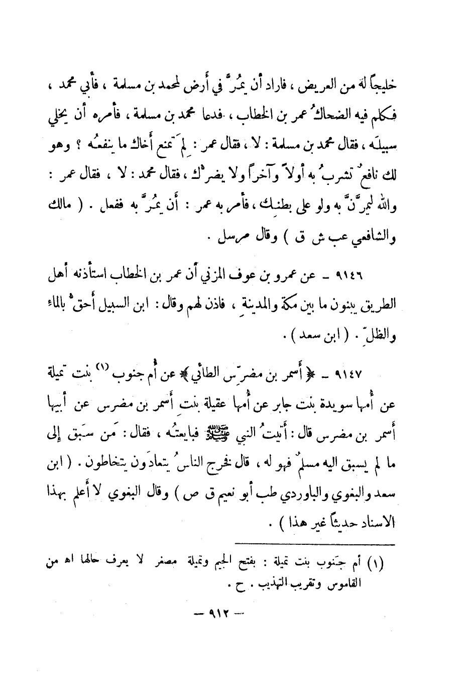 9146- عن عمرو بن عوف المزني أن عمر بن الخطاب استأذنه أهل الطريق يبنون ما بين مكة والمدينة، فأذن لهم وقال: ابن السبيل أحق بالماء والظل. ابن سعد.