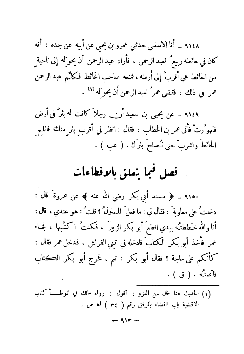 9150- "مسند أبي بكر رضي الله عنه" عن عروة قال: دخلت على معاوية، فقال لي: ما فعل المسلول؟ قلت: هو عندي، قال: أنا والله خططته بيدي اقطع أبو بكر الزبير، فكنت أكتبها، فجاء عمر فأخذ أبو بكر الكتاب فأدخله في ثني الفراش، فدخل عمر فقال: كأنكم على حاجة؟ فقال أبو بكر: نعم، فخرج أبو بكر الكتاب فأتممته. "ق".