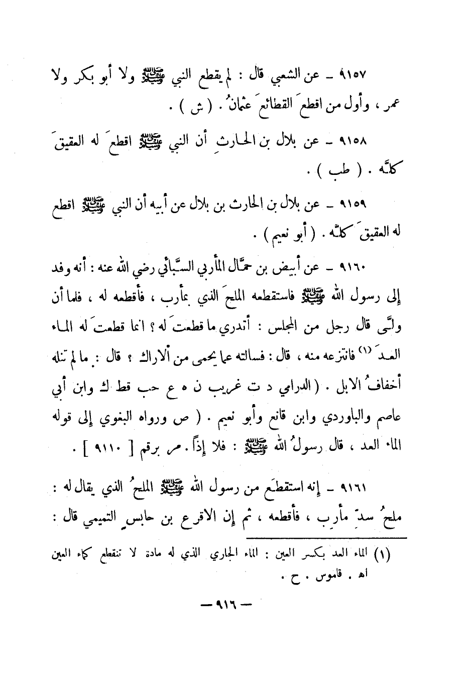 9161- إنه استقطع من رسول الله صلى الله عليه وسلم الملح الذي يقال له: ملح سد مأرب، فأقطعه، ثم إن الأقرع بن حابس التميمي قال: