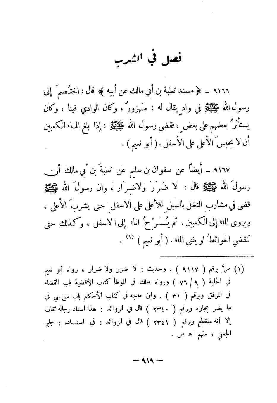 9167- أيضا عن صفوان بن سليم عن ثعلبة بن أبي مالك أن رسول الله صلى الله عليه وسلم قال: لا ضرر ولا ضرار، وإن رسول الله صلى الله عليه وسلم قضى في مشارب النخل بالسيل للأعلى على الأسفل حتى يشرب الأعلى، ويروى الماء إلى الكعبين، ثم يسرح الماء إلى الأسفل، وكذلك حتى تنقضي الحوائط أو يفنى الماء. أبو نعيم1.