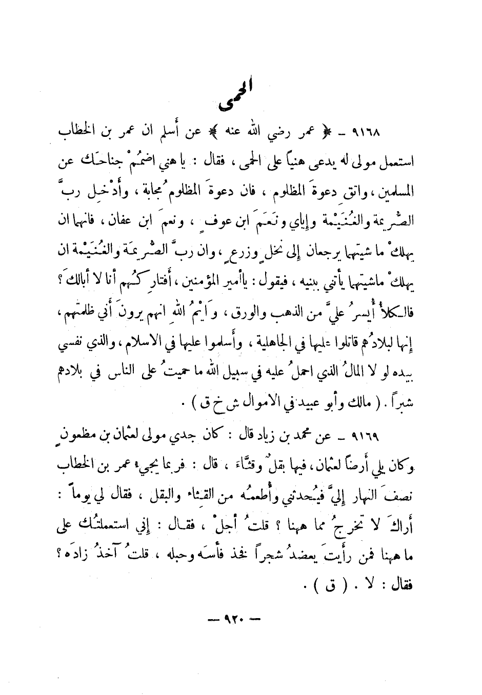 9168- "عمر رضي الله عنه" عن أسلم أن عمر بن الخطاب استعمل مولى له يدعى هنيا على الحمى، فقال: يا هني اضمم جناحك عن المسلمين، واتق دعوة المظلوم، فإن دعوة المظلوم مجابة، وأدخل رب الصريمة والغنيمة وإياي ونعم ابن عوف، ونعم ابن عفان، فإنهما إن يهلك ماشيتهما يرجعان إلى نخل وزرع، وإن رب الصريمة والغنيمة أن يهلك ماشيتهما يأتني ببنيه، فيقول: يا أمير المؤمنين، أفتاركهم أنا لا أبالك؟ فالكلأ أيسر علي من الذهب والورق، وأيم الله إنهم يرون أني ظلمتهم، إنها لبلادهم قاتلوا عليها في الجاهلية، وأسلموا عليها في الإسلام، والذي نفسي بيده لولا المال الذي أحمل عليه في سبيل الله ما حميت على الناس في بلادهم شبرا. مالك وأبو عبيد في الأموال "ش خ ق".