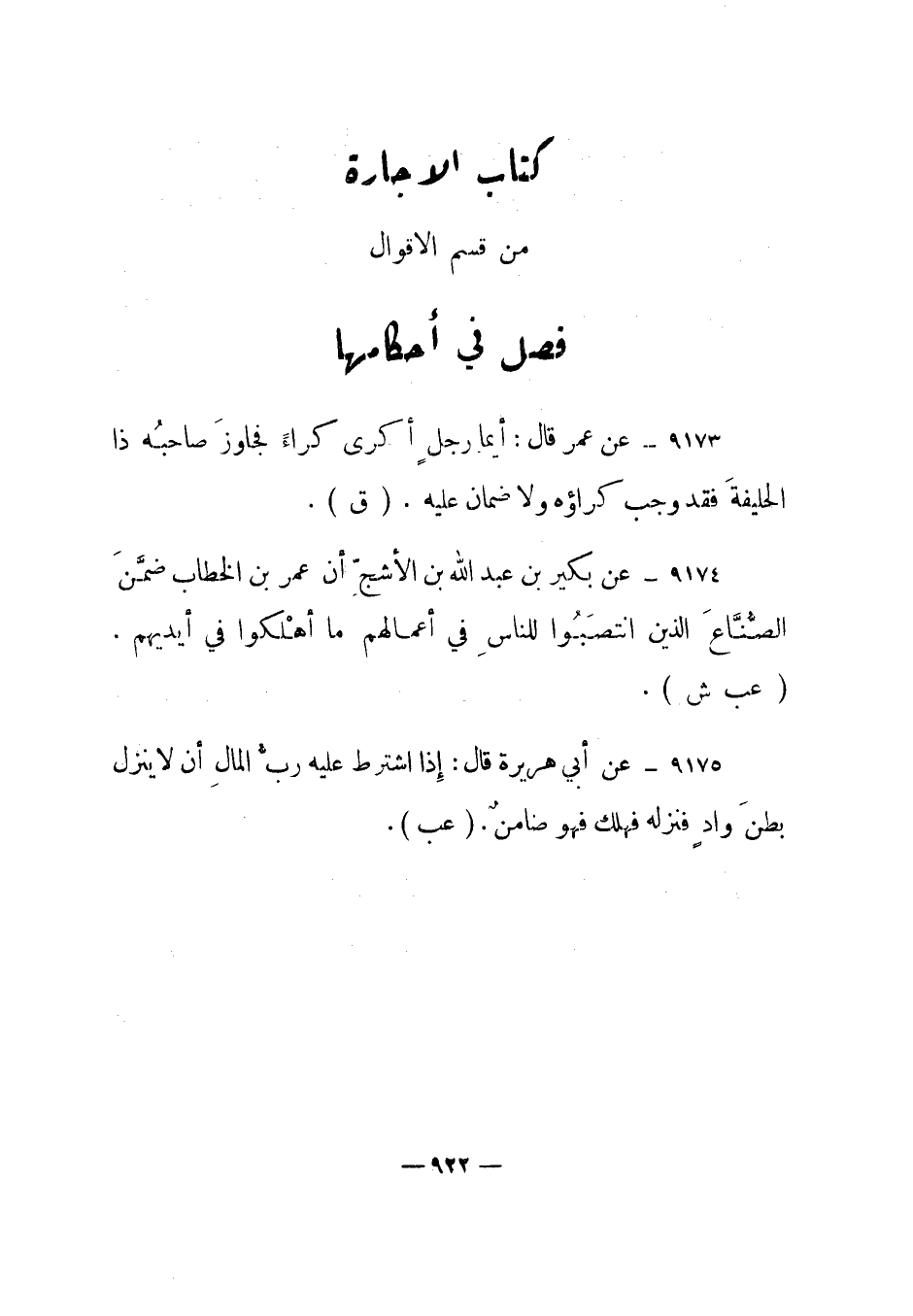 9173- عن عمر قال: أيما رجل أكرى كراء فجاوز صاحبه ذا الحليفة فقد وجب كراؤه ولا ضمان عليه. "ق".