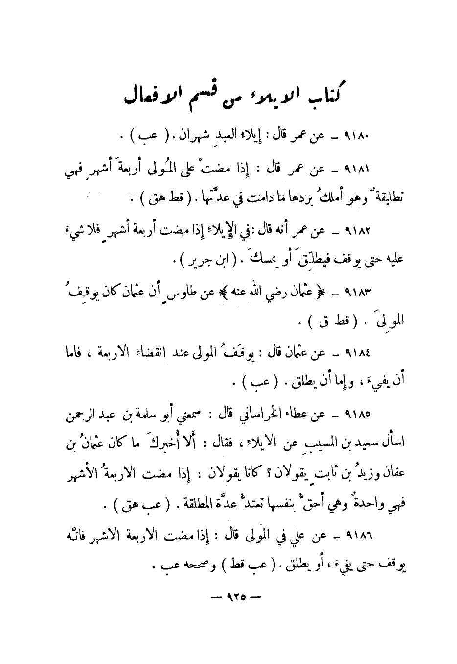 9186- عن علي في المولى قال: إذا مضت الأربعة الأشهر فإنه يوقف حتى يفيء، أو يطلق. "عب قط" وصححه "عب".