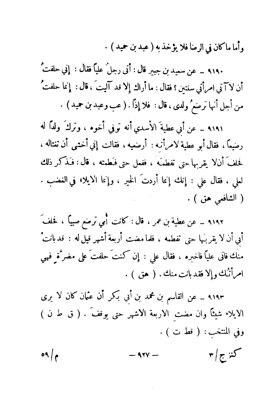 9191- عن أبي عطية الأسدي أنه توفي أخوه، وترك ولدا له رضيعا، فقال أبو عطية لامرأته: أرضعيه، فقالت إني أخشى أن تغتاله، فحلف أن لا يقربها حتى تفطمه، ففعل حتى فطمته، قال: فذكر ذلك لعلي، فقال علي: إنك إنما أردت الخير، وإنما الإيلاء في الغضب. الشافعي "هق".