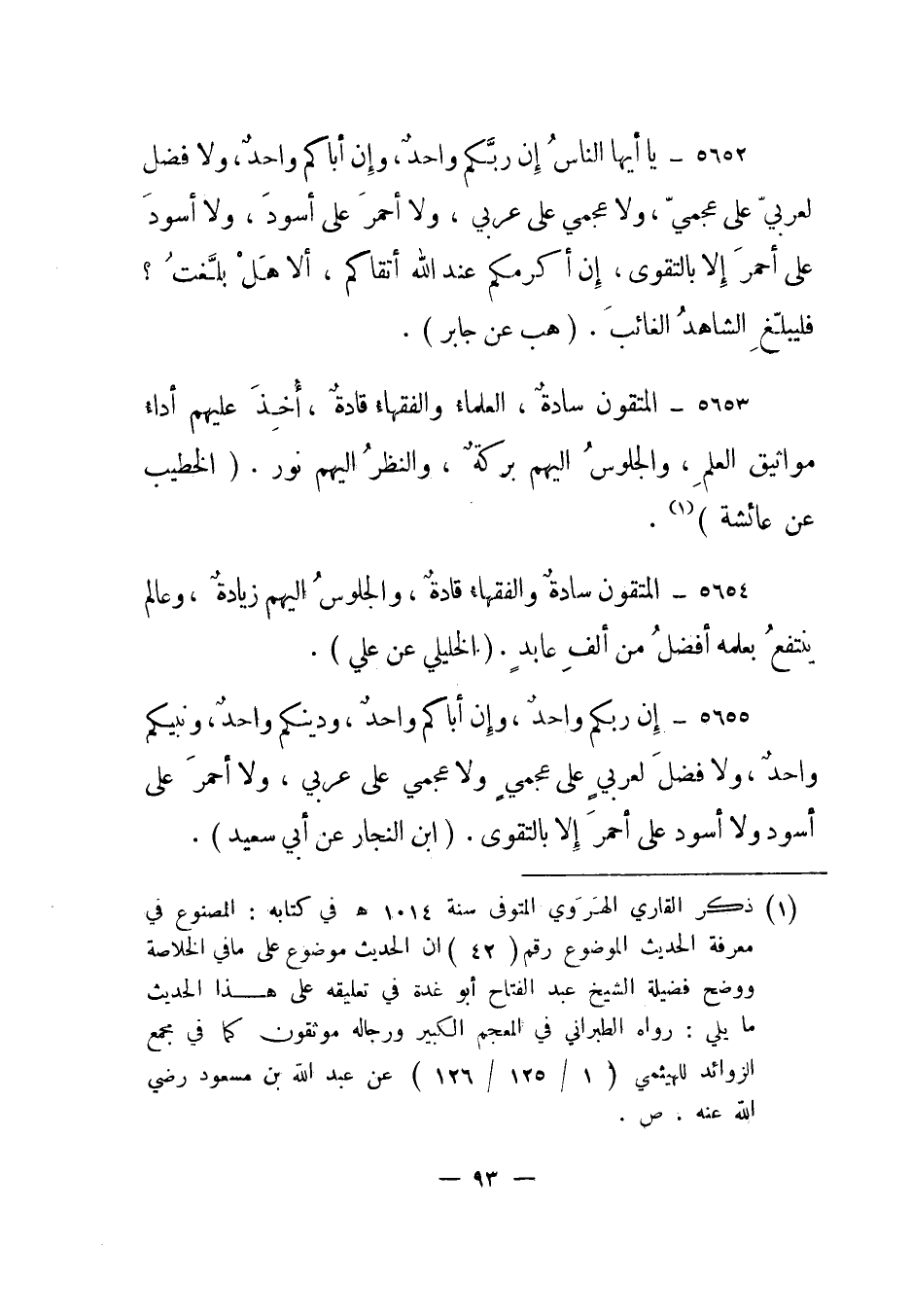 5652- يا أيها الناس إن ربكم واحد، وإن أباكم واحد، ولا فضل لعربي على عجمي، ولا عجمي على عربي، ولا أحمر على أسود، ولا أسود على أحمر إلا بالتقوى، إن أكرمكم عند الله أتقاكم، ألا هل بلغت؟ فليبلغ الشاهد الغائب. "هب عن جابر".
