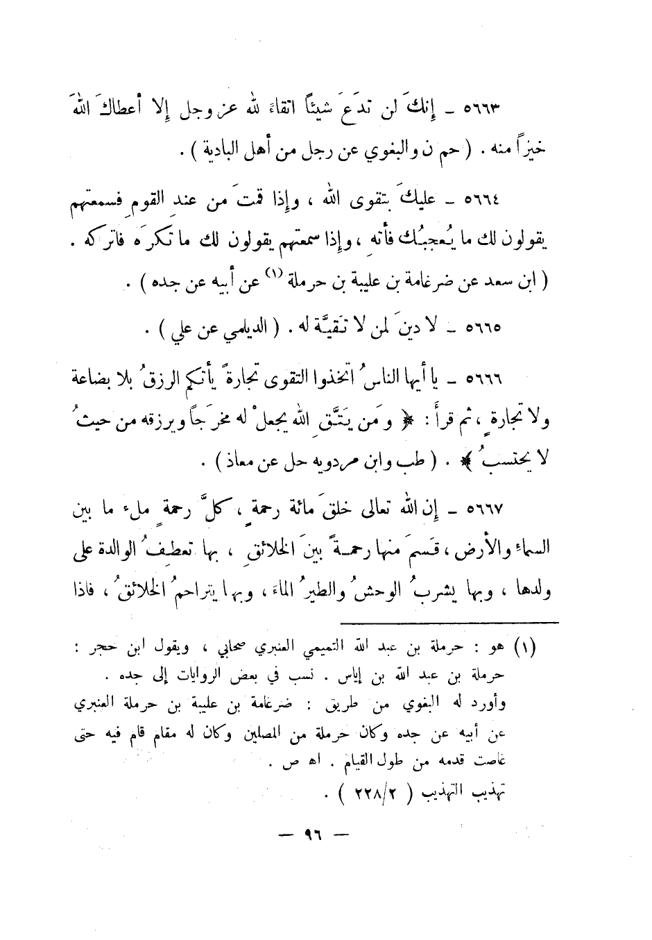 5667- إن الله تعالى خلق مائة رحمة، كل رحمة ملء ما بين السماء والأرض، قسم منها رحمة بين الخلائق، بها تعطف الوالدة على ولدها، وبها يشرب الوحش والطير الماء، وبها يتراحم الخلائق، فإذا