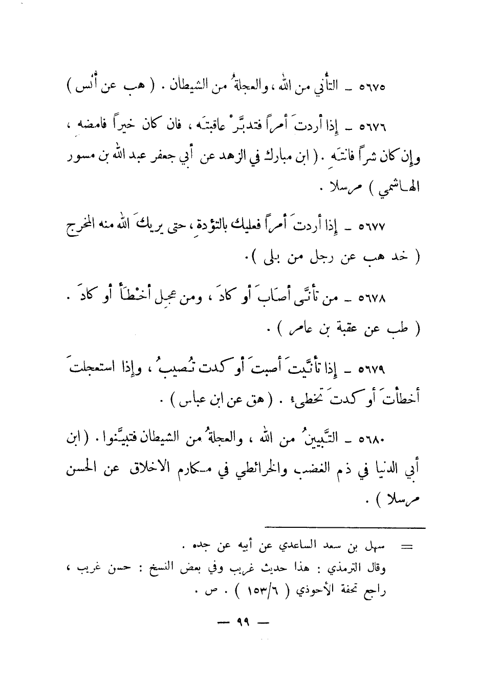 5677- إذا أردت أمرا فعليك بالتؤدة، حتى يريك الله منه المخرج."خد هب عن رجل من بلى".