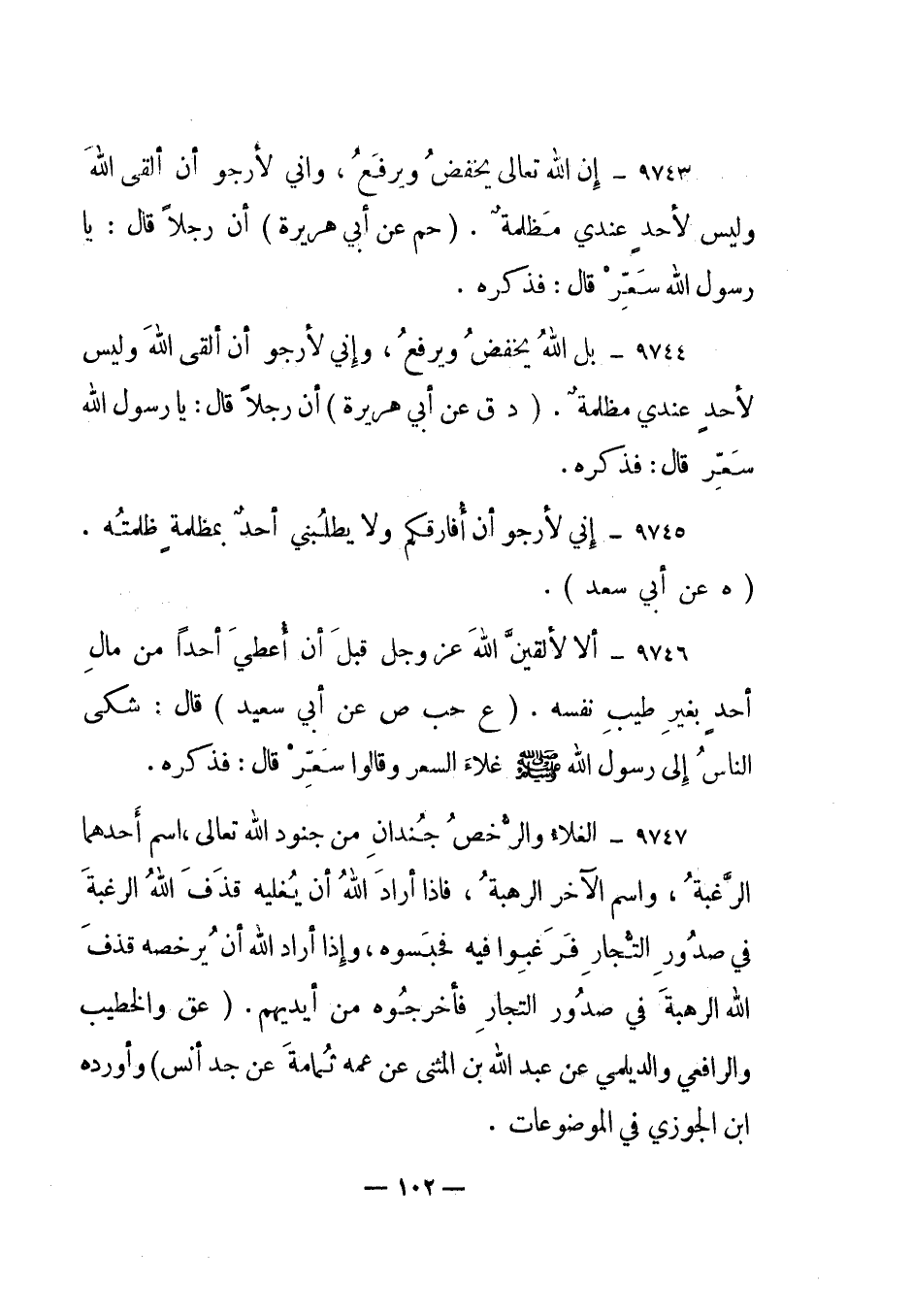 9744- "بل الله يخفض ويرفع، وإني لأرجو أن ألقى الله وليس لأحد عندي مظلمة". "د ق عن أبي هريرة" أن رجلا قال: يا رسول الله سعر قال: فذكره.