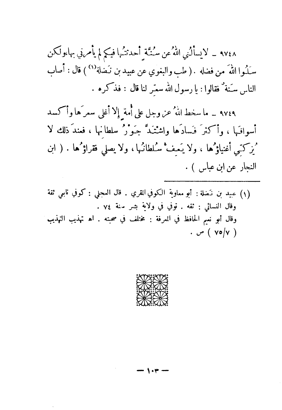 9749- "ما سخط الله عز وجل على أمة إلا أغلى سعرها وأكسد أسواقها، وأكثر فسادها واشتد جور سلطانها، فعند ذلك لا يزكي أغنياؤها، ولا يعف سلطانها، ولا يصلي فقراؤها". "ابن النجار عن ابن عباس".
