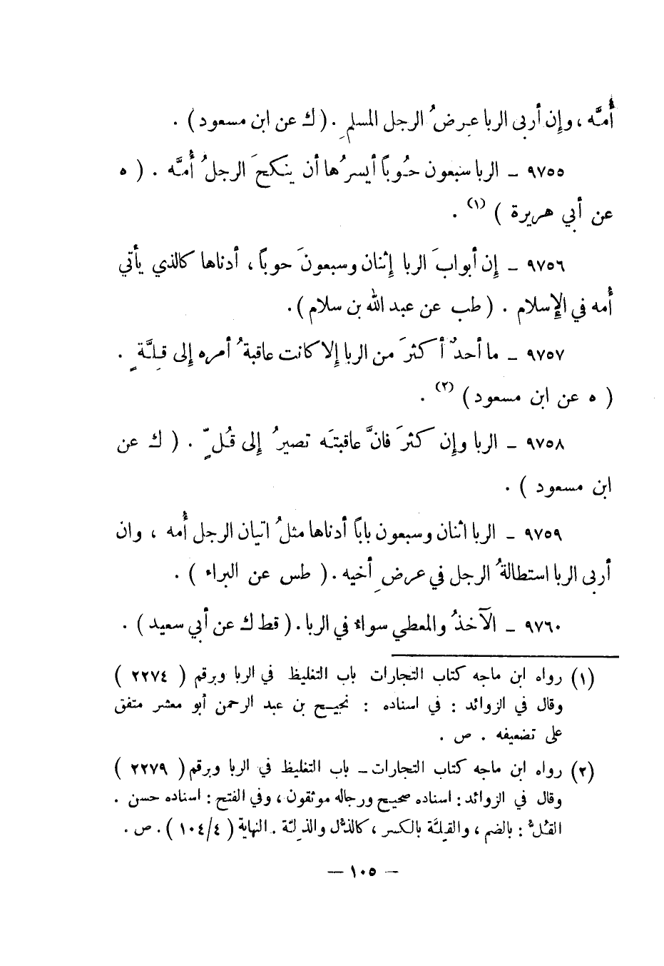 9757- "ما أحد أكثر من الربا إلا كانت عاقبة أمره إلى قلة". "هـ عن ابن مسعود" 2.