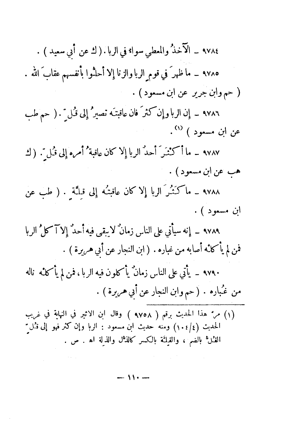 9787- "ما أكثر أحد الربا إلا كان عاقبة أمره إلى قل ". "ك هب عن ابن مسعود".