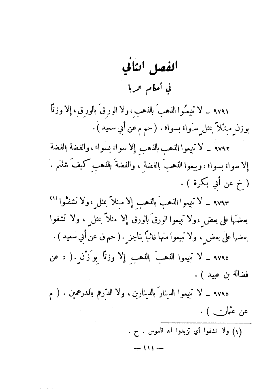 9791- "لا تبيعوا الذهب بالذهب، ولا الورق بالورق، إلا وزنا بوزن مثلا بمثل سواء بسواء". "حم م عن أبي سعيد".