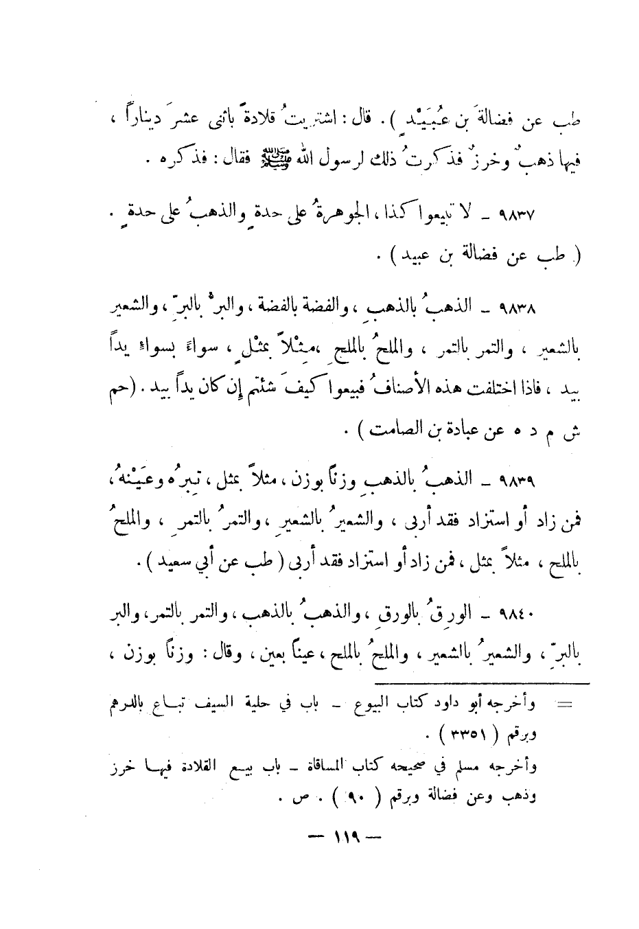 9837- "لا تبيعوا كذا، الجوهرة على حدة والذهب على حدة". "طب عن فضالة بن عبيد".