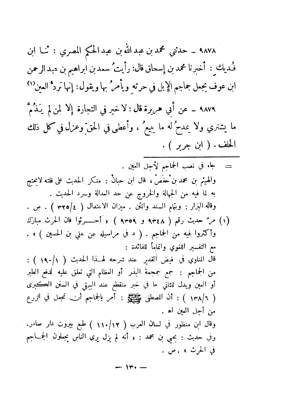 9878- حدثني محمد بن عبد الله بن عبد الحكم المصري: ثنا ابن فديك: أخبرنا محمد بن إسحاق قال: "رأيت سعد بن إبراهيم بن عبد الرحمن ابن عوف يجعل جماجم الإبل في حرثه ويأمر بها ويقول: إنها ترد العين1".