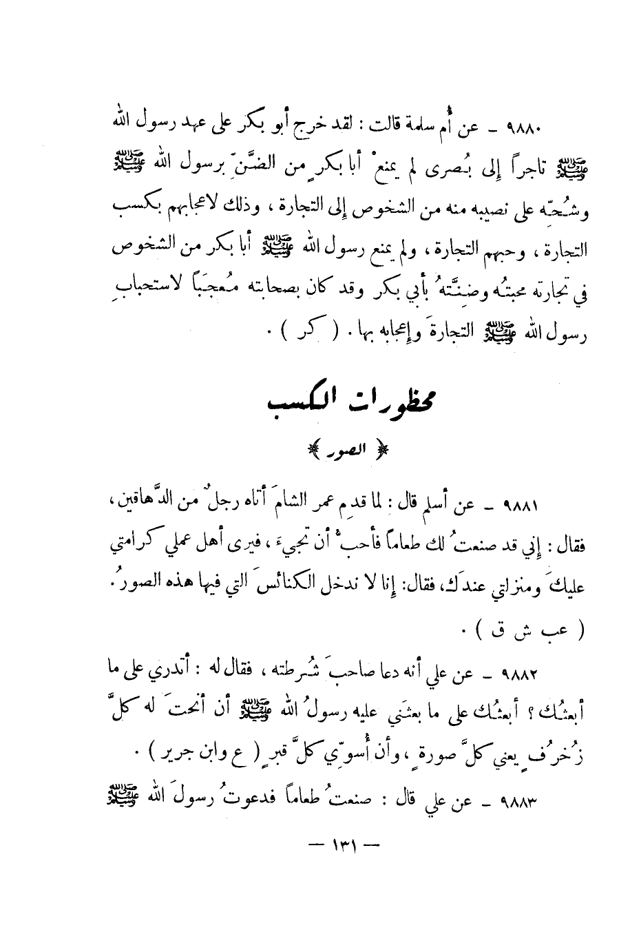 9880- عن أم سلمة قالت: "لقد خرج أبو بكر على عهد رسول الله صلى الله عليه وسلم تاجرا إلى بصرى لم يمنع أبا بكر من الضنن برسول الله صلى الله عليه وسلم وشحه على نصيبه منه من الشخوص إلى التجارة، وذلك لأعجابهم بكسب التجارة، وحبهم التجارة، ولم يمنع رسول الله صلى الله عليه وسلم أبا بكر من الشخوص في تجارته محبته وضنته بأبي بكر وقد كان بصحابته معجبا لاستحباب رسول الله صلى الله عليه وسلم التجارة وإعجابه بها". "كر".