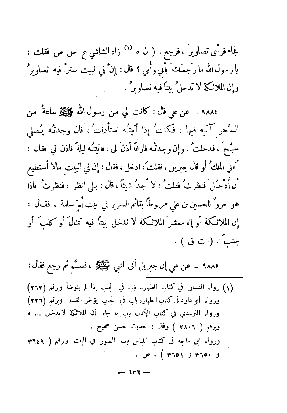 9884- عن علي قال: "كانت لي من رسول الله صلى الله عليه وسلم ساعة من السحر آتيه فيها، فكنت إذا أتيته استأذنت، فإن وجدته يصلي سبح، فدخلت، وإن وجدته فارغا أذن لي، فأتيته ليلة فأذن لي فقال: أتاني الملك أو قال جبريل، فقلت: ادخل، فقال: إن في البيت ما لا أستطيع أن أدخل فنظرت فقلت: لا أجد شيئا، قال: بلى انظر، فنظرت فإذا هو جرو للحسين بن علي مربوطا بقائم السرير في بيت أم سلمة، فقال: إن الملائكة أو إنا معشر الملائكة لا ندخل بيتا فيه تمثال أو كلب أو جنب". "ت ق".