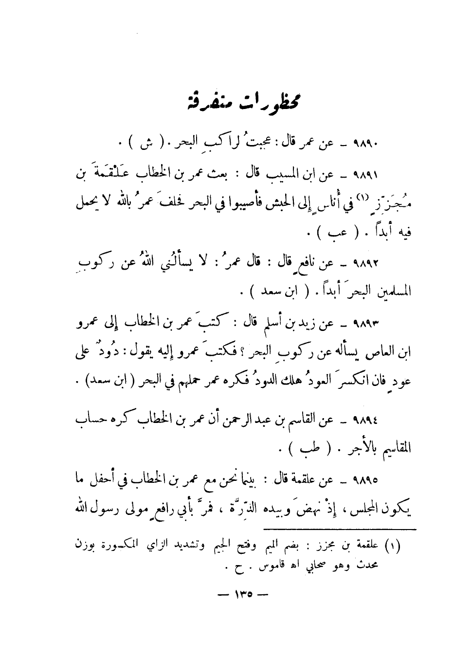 9891- عن ابن المسيب قال: "بعث عمر بن الخطاب علقمة بن مجزز 1 في أناس إلى الحبش فأصيبوا في البحر فحلف عمر بالله لا يحمل فيه أبدا". "عب".