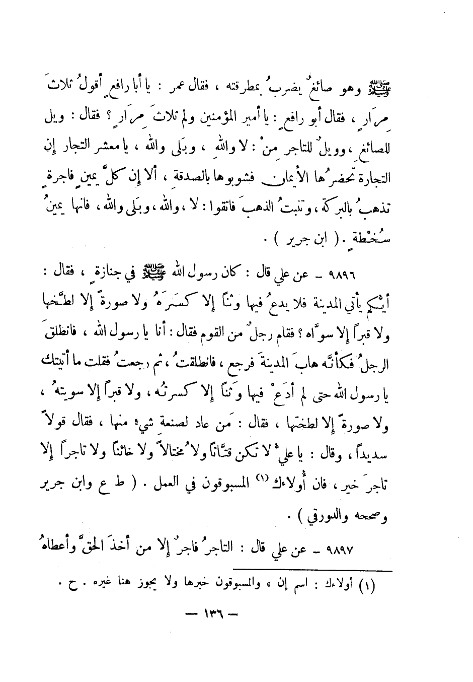 9897- عن علي قال: "التاجر فاجر إلا من أخذ الحق وأعطاه".