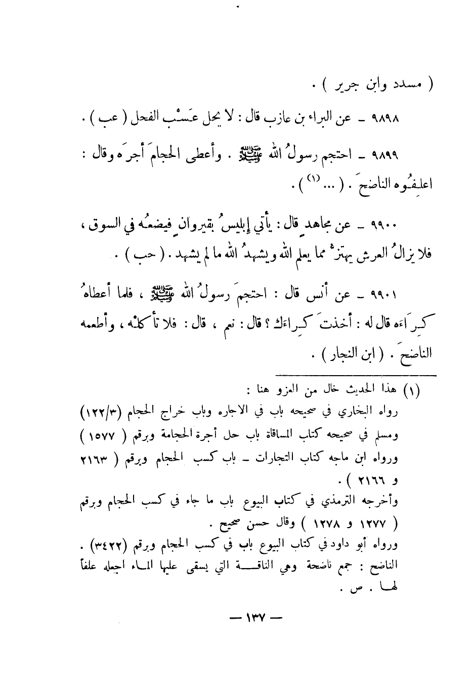 9899- "احتجم رسول الله صلى الله عليه وسلم. وأعطى الحجام أجره وقال: اعلفوه الناضح". " ... 1".