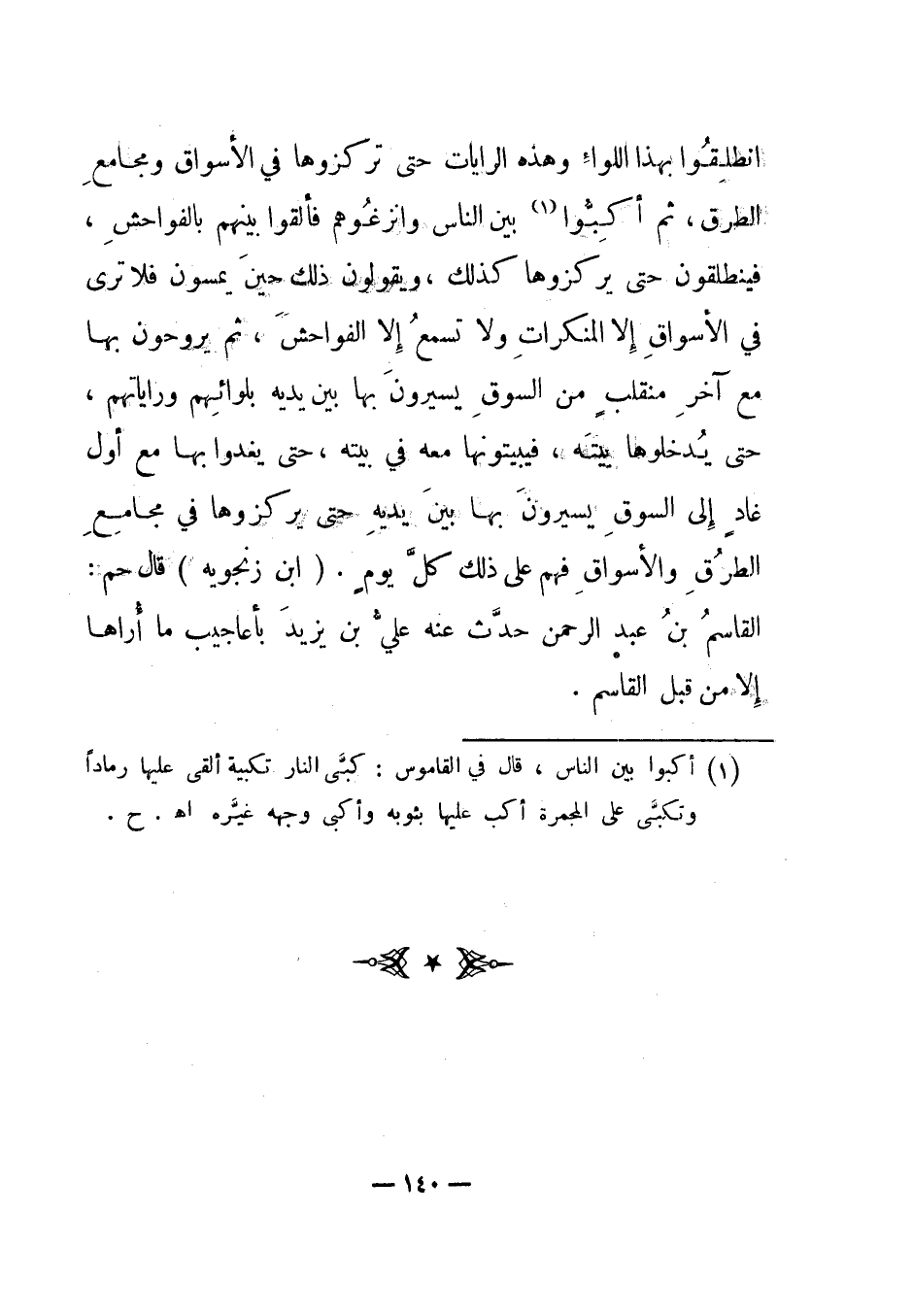 انطلقوا بهذا اللواء وهذه الرايات حتى تركزوها في الأسواق ومجامع الطرق، ثم أكبوا1 بين الناس وانزغوهم فألقوا بينهم بالفواحش، فينطلقون حتى يركزوها كذلك، ويقولون ذلك حين يمسون فلا ترى في الأسواق إلا المنكرات ولا تسمع إلا الفواحش، ثم يروحون بها مع آخر منقلب من السوق يسيرون بها بين يديه بلوائهم وراياتهم، حتى يدخلوها بيته، فيبيتونها معه في بيته، حتى يغدوا بها مع أول غاد إلى السوق يسيرون بها بين يديه حتى يركزوها في مجامع الطرق والأسواق فهم على ذلك كل يوم. "ابن زنجويه" قال حم: القاسم بن عبد الرحمن حدث عنه علي بن يزيد بأعاجيب ما أراها إلا من قبل القاسم.