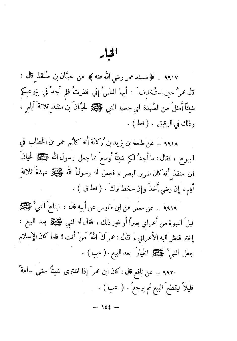 9917- "مسند عمر رضي الله عنه" عن حيان بن منقذ قال: "قال عمر حين استخلف: أيها الناس إني نظرت فلم أجد في بيوعكم شيئا أمثل من العهدة التي جعلها النبي صلى الله عليه وسلم لحيان بن منقذ ثلاثة أيام، وذلك في الرقيق". "قط".