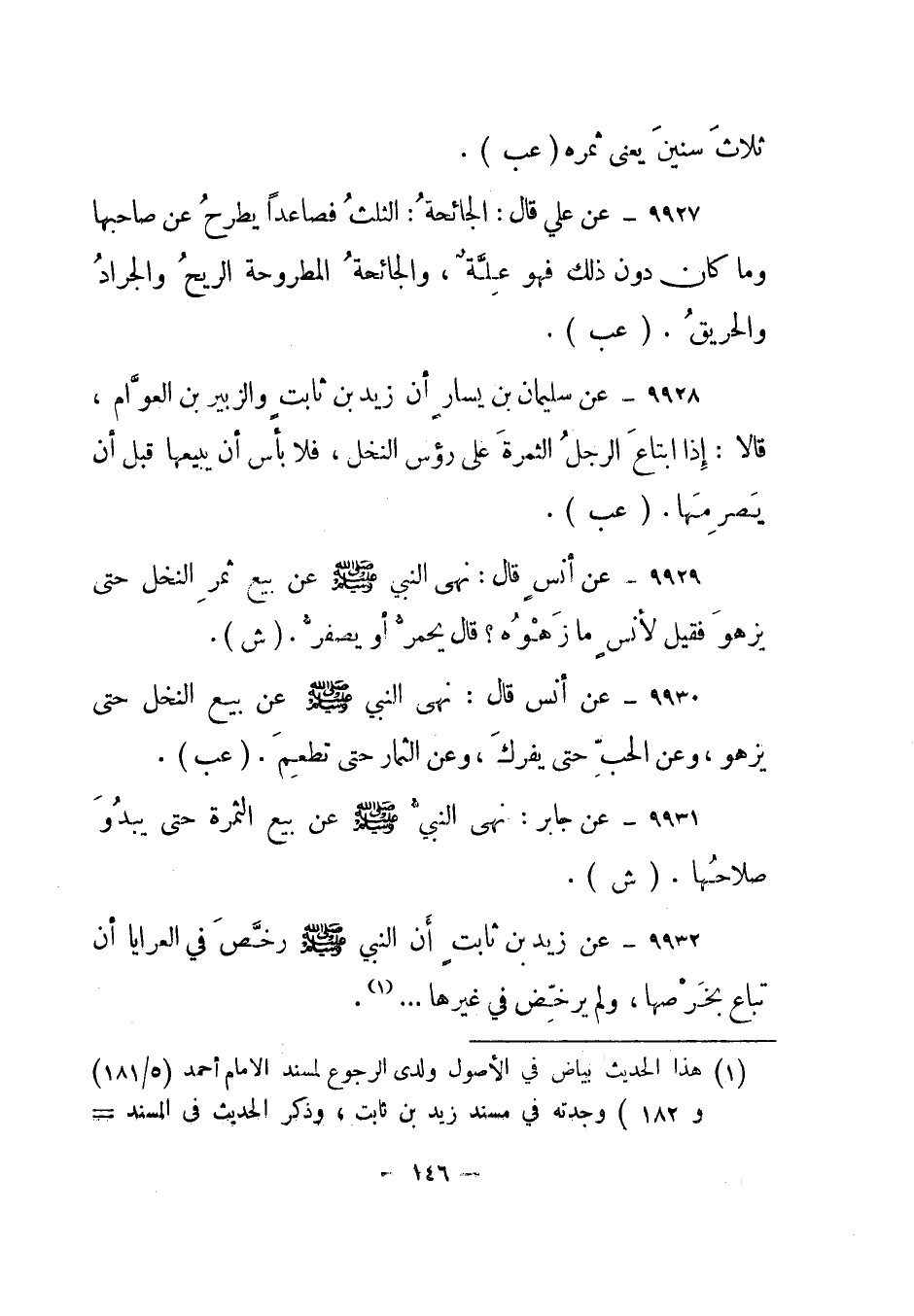9931- عن جابر: "نهى النبي صلى الله عليه وسلم عن بيع الثمرة حتى يبدو صلاحها". "ش".