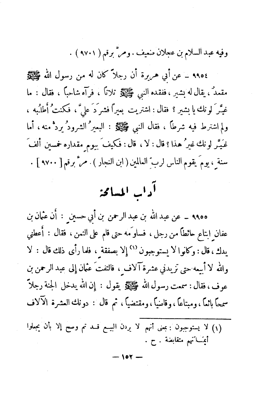 9955- عن عبد الله بن عبد الرحمن بن أبي حسين: "أن عثمان بن عفان ابتاع حائطا من رجل، فساومه حتى قام على الثمن، فقال: أعطني يدك، قال: وكانوا لا يستوجبون1 إلا بصفقة، فلما رأى ذلك قال: لا والله لا أبيعه حتى تزيدني عشرة آلاف، فالتفت عثمان إلى عبد الرحمن بن عوف، فقال: سمعت رسول الله صلى الله عليه وسلم يقول: إن الله يدخل الجنة رجلا سمحا بائعا، ومبتاعا، وقاضيا، ومقتضيا، ثم قال: دونك العشرة الآلاف