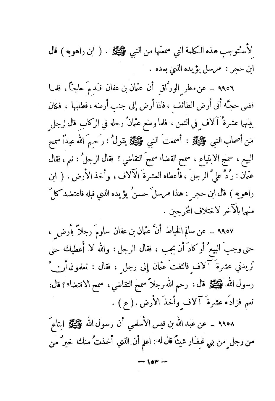 9956- "عن مطر الوراق أن عثمان بن عفان قدم حاجا، فلما قضى حجه أتى أرض الطائف، فإذا أرض إلى جنب أرضه، فطلبها، فكان بينهما عشرة آلاف في الثمن، فلما وضع عثمان رجله في الركاب قال لرجل من أصحاب النبي صلى الله عليه وسلم: أسمعت النبي صلى الله عليه وسلم يقول: رحم الله عبدا سمح البيع، سمح الإبتياع، سمح القضاء سمح التقاضي؟ فقال الرجل: نعم، فقال عثمان: رد علي الرجل، فأعطاه العشرة الآلاف، وأخذ الأرض". "ابن راهويه" قال ابن حجر: هذا مرسل حسن يؤيده الذي قبله فاعتضد كل منهما بالآخر لاختلاف المخرجين.