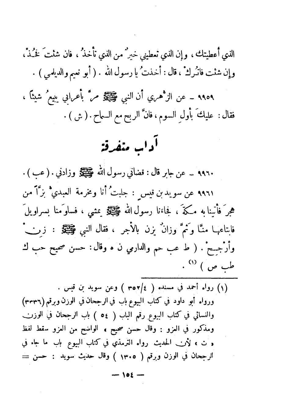 9961- عن سويد بن قيس: "جلبت أنا ومخرمة العبدي بزا من هجر فأتينا به مكة، فجاءنا رسول الله صلى الله عليه وسلم يمشي، فساومنا بسراويل فابتاعها منا وثم وزان يزن بالأجر، فقال النبي صلى الله عليه وسلم: زن وأرجح". "ط عب حم والدارمي ن هـ وقال: حسن صحيح حب ك طب ص" 1.