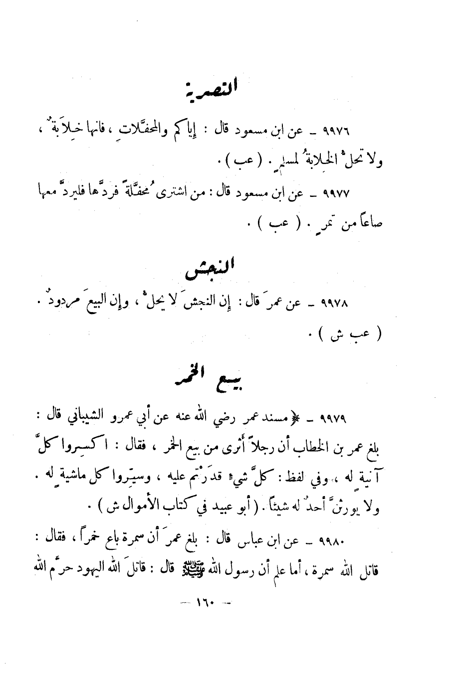 9979- مسند عمر رضي الله عنه عن أبي عمرو الشيباني قال: "بلغ عمر بن الخطاب أن رجلا أثرى من بيع الخمر، فقال: اكسروا كل آنية له، وفي لفظ: كل شيء قدرتم عليه، وسيروا كل ماشية له. ولا يورثن أحد له شيئا". "أبو عبيد في كتاب الأموال ش".