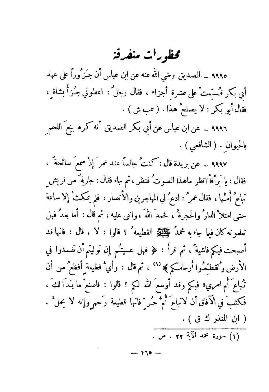 9997- عن بريدة قال: "كنت جالسا عند عمر إذ سمع صائحة"، فقال: "يا يرفأ انظر ما هذا الصوت فنظر، ثم جاء" فقال: "جارية من قريش تباع أمها"، فقال عمر: "ادع لي المهاجرين والأنصار، فلم يمكث إلا ساعة حتى امتلأ الدار والحجرة، فحمد الله، وأثنى عليه"، ثم قال: "أما بعد فهل تعلمونه كان فيما جاء به محمد صلى الله عليه وسلم القطيعة"؟ قالوا: "لا"، قال: "فإنها قد أصبحت فيكم فاشية، ثم قرأ: {فَهَلْ عَسَيْتُمْ إِنْ تَوَلَّيْتُمْ أَنْ تُفْسِدُوا فِي الْأَرْضِ وَتُقَطِّعُوا أَرْحَامَكُمْ} 1، ثم قال: "وأي قطيعة أفظع من أن تباع أم امرئ فيكم وقد أوسع الله لكم"؟ قالوا: "فاصنع ما بدا لك، فكتب في الآفاق أن لا تباع أم حر فإنها قطيعة رحم وإنه لا يحل". "ابن المنذر ك ق".