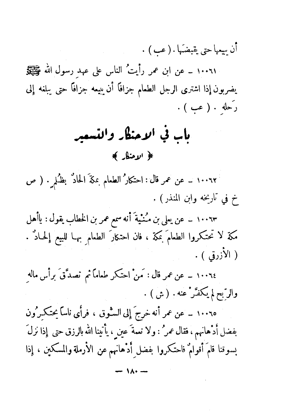 10065- عن عمرا أنه خرج إلى السوق، فرأى ناسا يحتكرون بفضل أدهانهم، فقال عمر: "ولا نعمة عين، يأتينا الله بالرزق حتى إذا نزل بسوقنا قام أقوام فاحتكروا بفضل أدهانهم عن الأرملة والمسكين، إذا