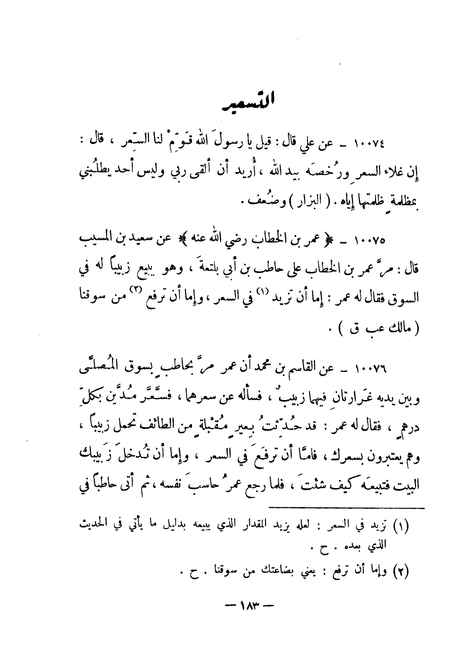 10075- عمر بن الخطاب رضي الله عنه، عن سعيد بن المسيب قال: "مر عمر بن الخطاب على حاطب بن أبي بلتعة، وهو يبيع زبيبا له في السوق" فقال له عمر: "إما أن تزيد 1 في السعر، وإما أن ترفع2 من سوقنا". "مالك عب ق".
