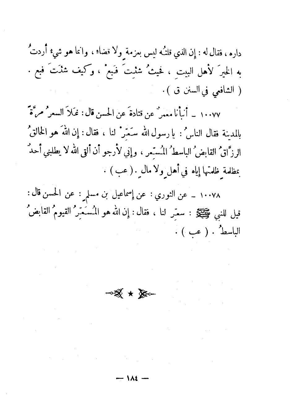 10077- أنبأنا معمر عن قتادة عن الحسن قال: "غلا السعر مرة بالمدينة" فقال الناس: "يا رسول الله سعر لنا"، فقال: "إن الله هو الخالق الرزاق القابض الباسط المسعر، وإني لأرجو أن ألقى الله لا يطلبني أحد بمظلمة ظلمتها إياه في أهل ولا مال". "عب".