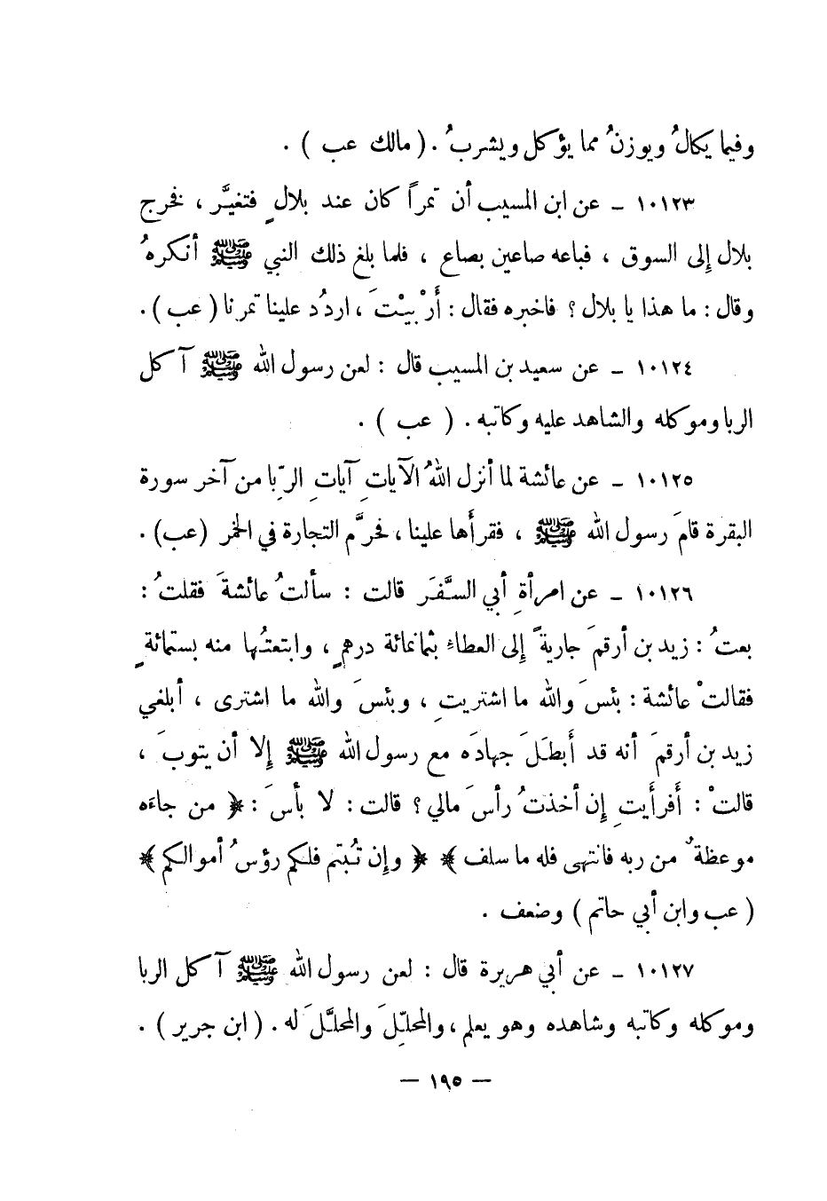 10127- عن أبي هريرة قال: "لعن رسول الله صلى الله عليه وسلم آكل الربا وموكله وكاتبه وشاهده وهو يعلم، والمحلل والمحلل له". "ابن جرير".