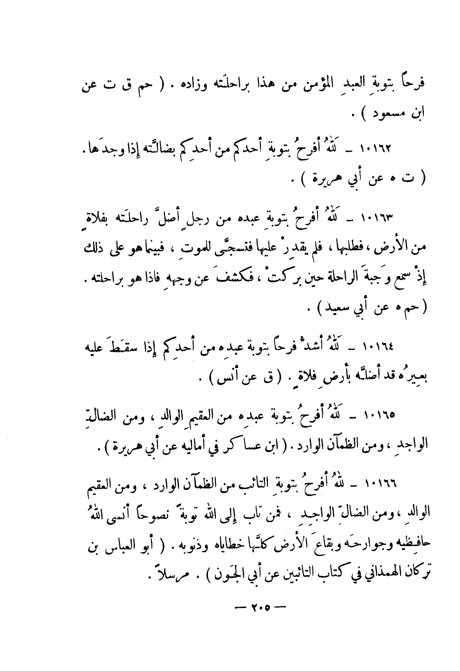 10166- "لله أفرح بتوبة التائب من الظمآن الوارد، ومن العقيم الوالد، ومن الضال الواجد، فمن تاب إلى الله توبة نصوحا أنسى الله حافظيه وجوارحه وبقاع الأرض كلها خطاياه وذنوبه". "أبو العباس بن تركان الهمذاني في كتاب التائبين عن أبي الجون". مرسلا.