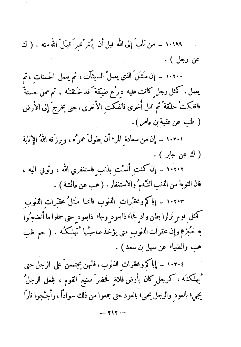 10203- "إياكم ومحقرات الذنوب فإنما مثل محقرات الذنوب كمثل قوم نزلوا بطن واد فجاء ذا بعود وجاء ذا بعود حتى حملوا ما أنضجوا به خبزهم وإن محقرات الذنوب متى يؤخذ صاحبها تهلكه". "حم طب هب والضياء عن سهل بن سعد".