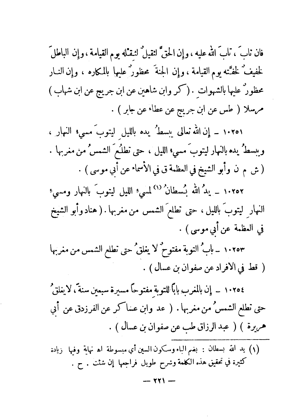 10252- "يد الله بسطان 1 لمسيء الليل ليتوب بالنهار ومسيء النهار ليتوب بالليل، حتى تطلع الشمس من مغربها". "هناد وأبو الشيخ في العظمة عن أبي موسى".