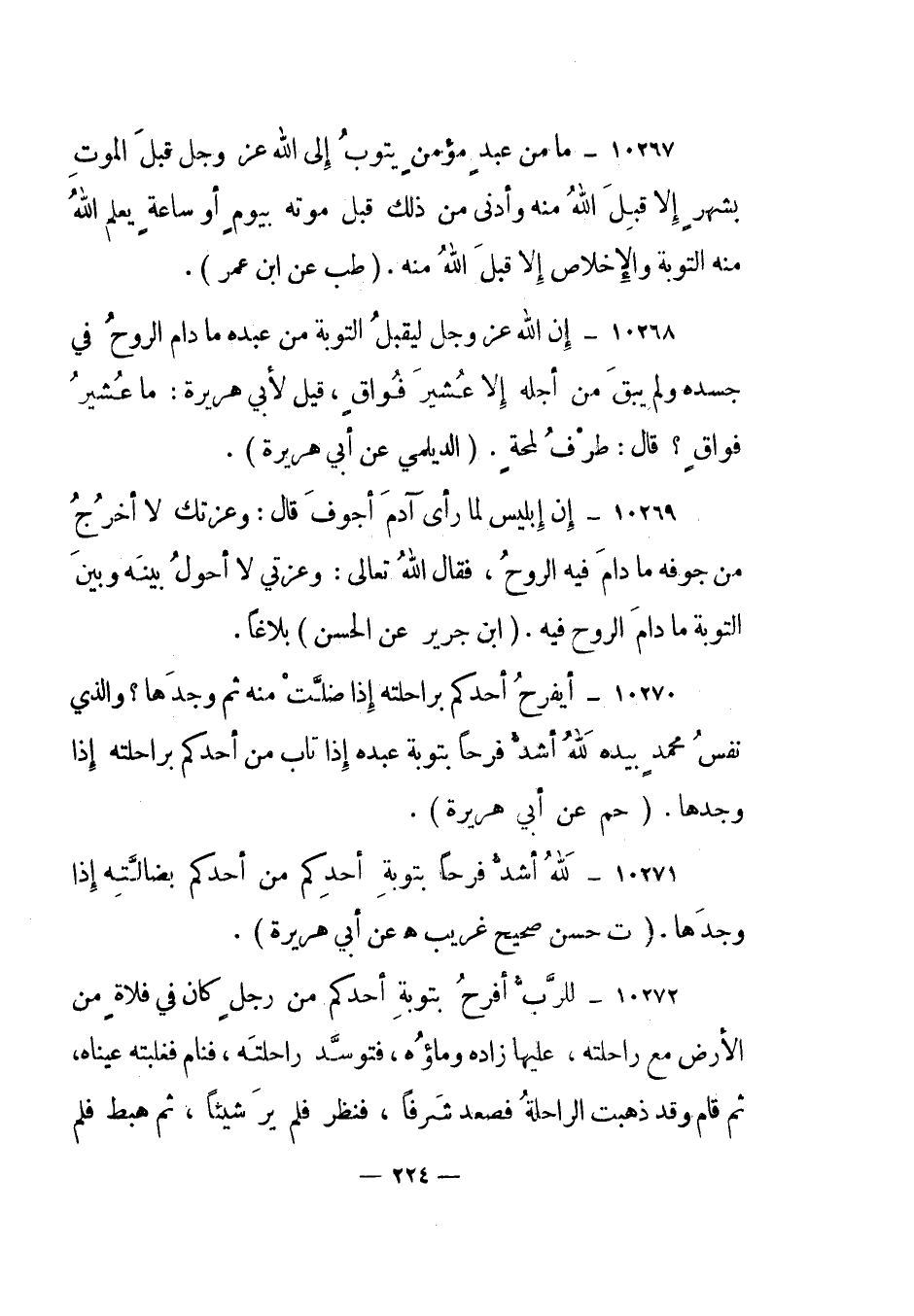 10270- "أيفرح أحدكم براحلته إذا ضلت منه ثم وجدها؟ والذي نفس محمد بيده لله أشد فرحا بتوبة عبده إذا تاب من أحدكم براحلته إذا وجدها". "حم عن أبي هريرة".