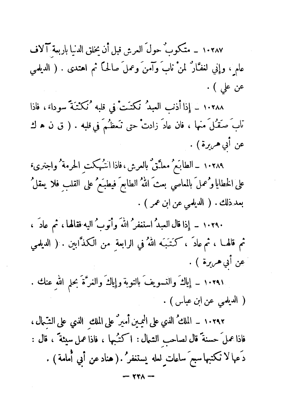 10288- "إذا أذنب العبد نكتت في قلبه نكتة سوداء، فإذا تاب صقل منها، فإن عاد زادت حتى تعظم في قلبه". "ق ن هـ ك عن أبي هريرة".