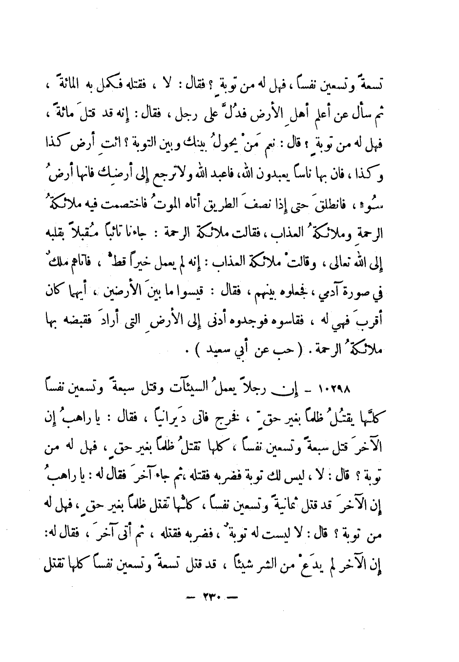 10298- "إن رجلا يعمل السيئآت وقتل سبعة وتسعين نفسا كلها يقتل ظلما بغير حق، فخرج فأتى ديرانيا، فقال: يا راهب إن الآخر قتل سبعة وتسعين نفسا، كلها تقتل ظلما بغير حق، فهل له من توبة؟ قال: لا، ليس لك توبة فضربه فقتله، ثم جاء آخر فقال له: يا راهب إن الآخر قد قتل ثمانية وتسعين نفسا، كلها تقتل ظلما بغير حق، فهل له من توبة؟ قال: لا ليست له توبة، فضربه فقتله، ثم أتى آخر، فقال له: إن الآخر لم يدع من الشر شيئا، قد قتل تسعة وتسعين نفسا كلها تقتل