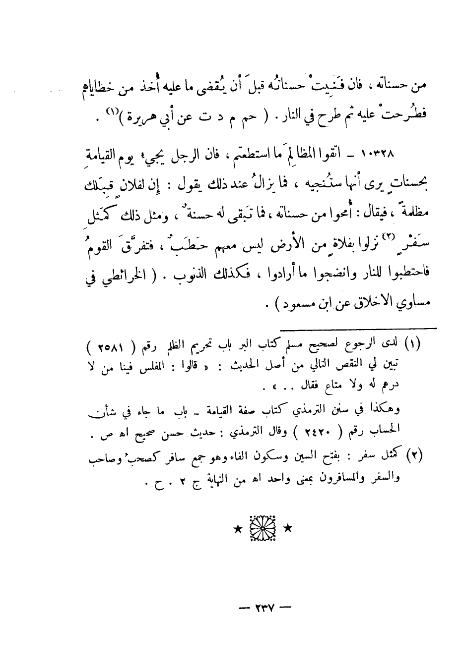 من حسناته، فإن فنيت حسناته قبل أن يقضى ما عليه أخذ من خطاياهم فطرحت عليه ثم طرح في النار". "حم م د ت عن أبي هريرة" 1.