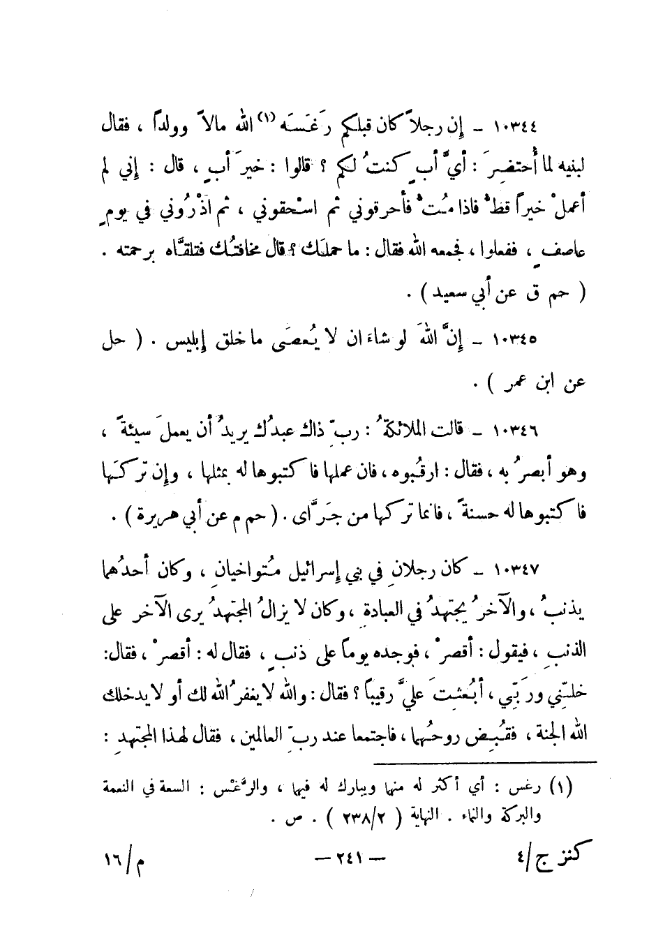 10344- "إن رجلا كان قبلكم رغسه 1 الله مالا وولدا، فقال لبنيه لما احتضر: أي أب كنت لكم؟ قالوا: خير أب، قال: إني لم أعمل خيرا قط فإذا مت فأحرقوني ثم اسحقوني، ثم اذروني في يوم عاصف، ففعلوا، فجمعه الله فقال: ما حملك؟ قال مخافتك فتلقاه برحمته". "حم ق عن أبي سعيد".