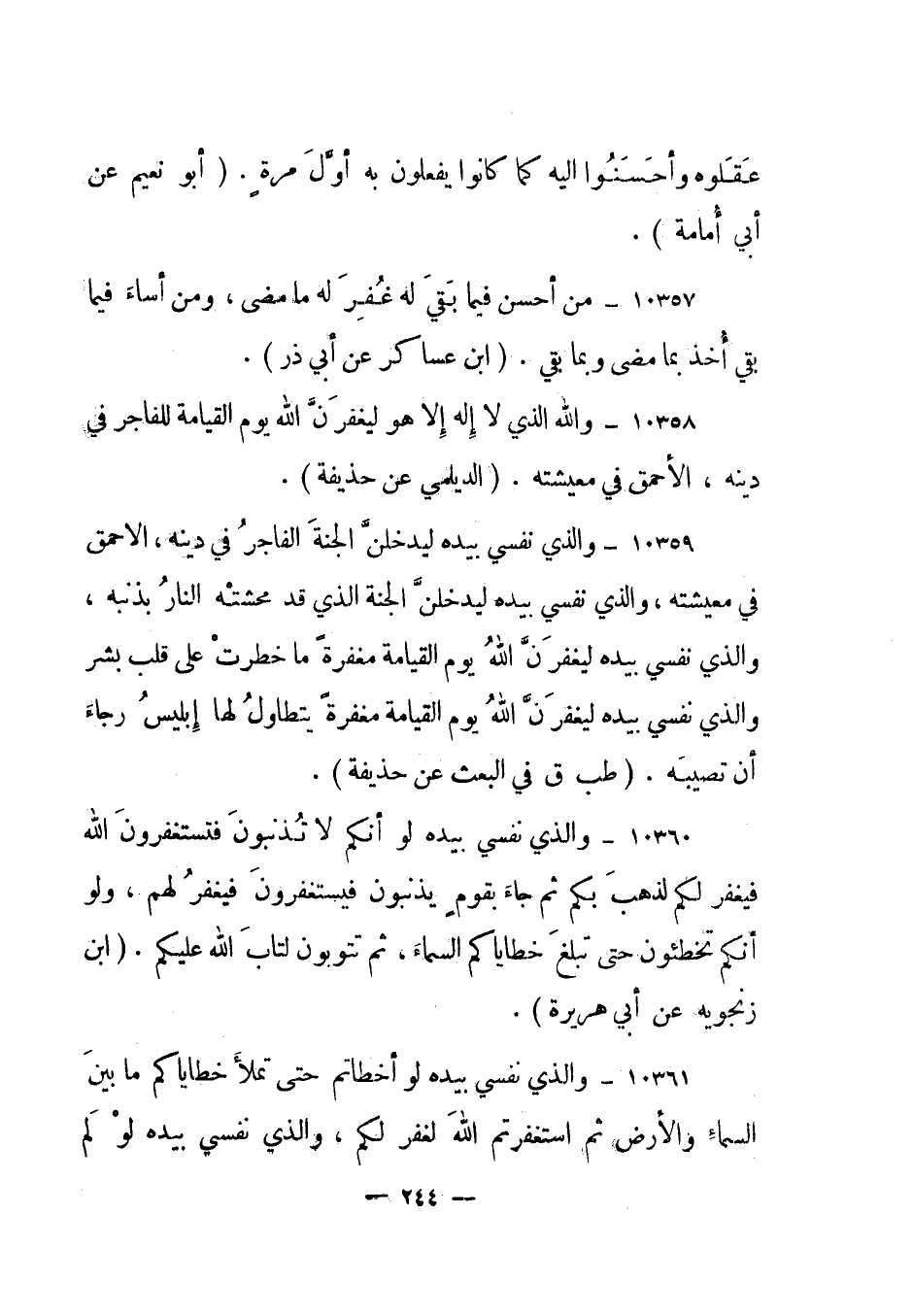 10359- "والذي نفسي بيده ليدخلن الجنة الفاجر في دينه، الأحمق في معيشته، والذي نفسي بيده ليدخلن الجنة الذي قد محشته النار بذنبه، والذي نفسي بيده ليغفرن الله يوم القيامة مغفرة ما خطرت على قلب بشر والذي نفسي بيده ليغفرن الله يوم القيامة مغفرة يتطاول لها إبليس رجاء أن تصيبه". "طب ق في البعث عن حذيفة".