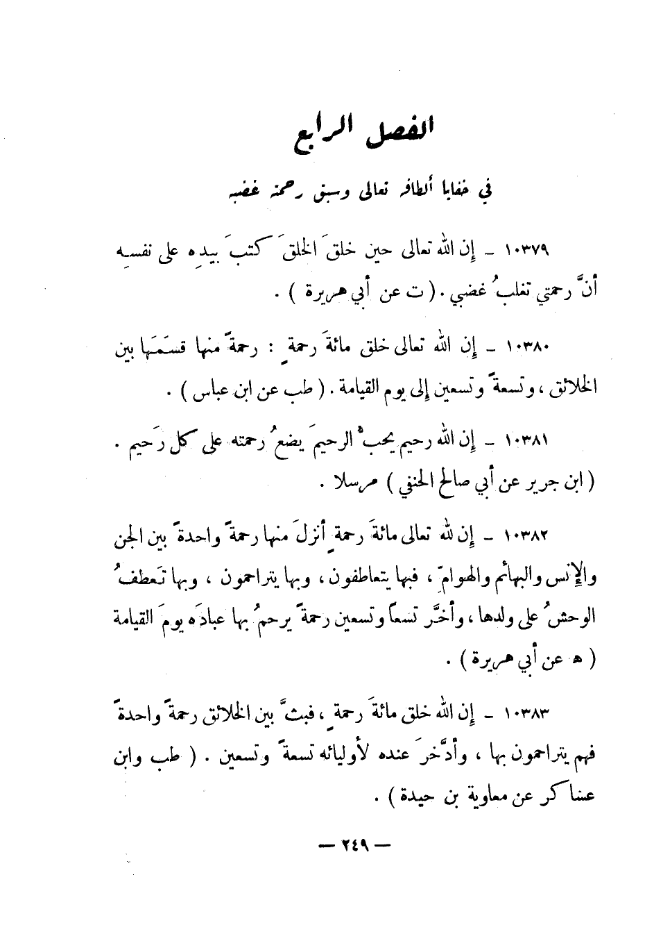 10383- " إن الله خلق مائة رحمة، فبث بين الخلائق رحمة واحدة فهم يتراحمون بها، وأدخر عنده لأوليائه تسعة وتسعين". "طب وابن عساكر عن معاوية بن حيدة".