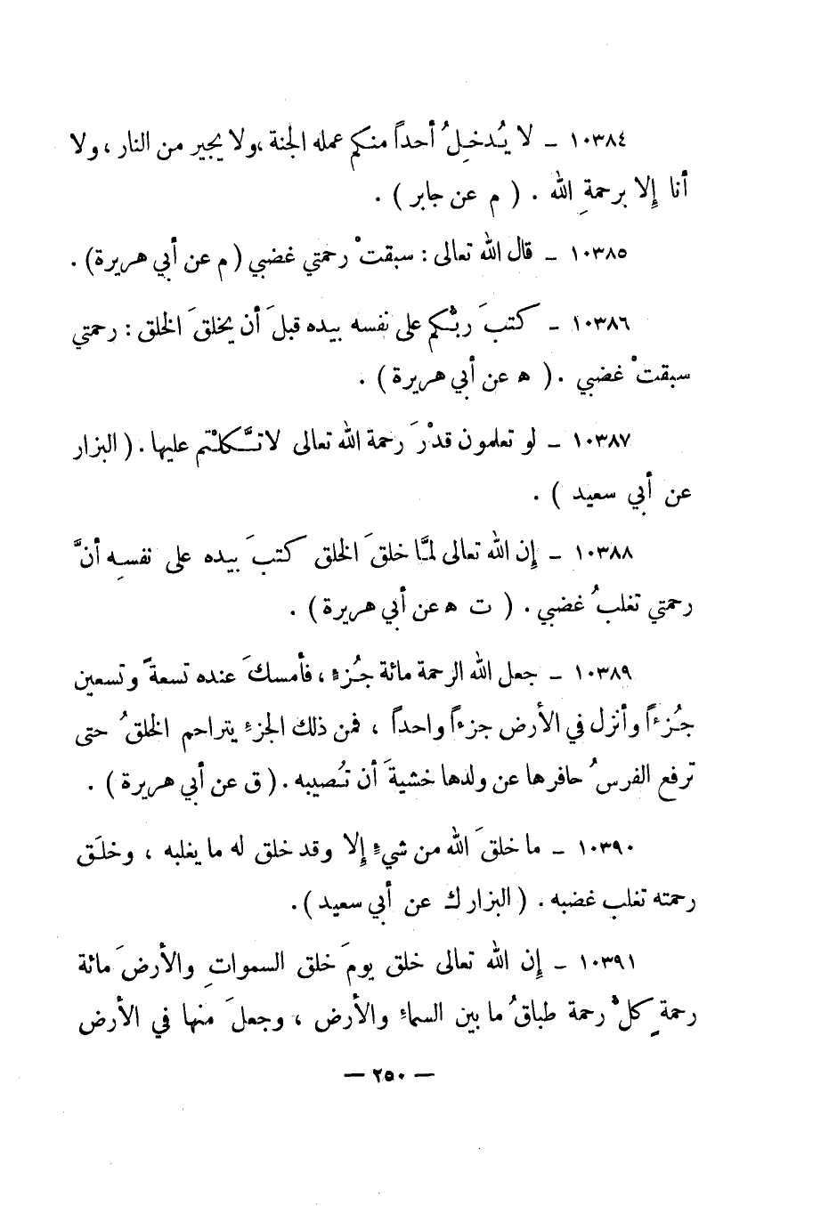 10391- "إن الله تعالى خلق يوم خلق السموات والأرض مائة رحمة كل رحمة طباق ما بين السماء والأرض، وجعل منها في الأرض