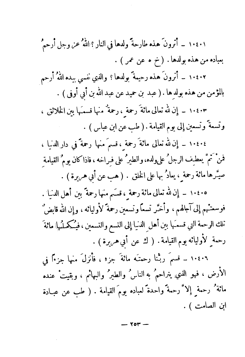 10404- "إن لله تعالى مائة رحمة، قسم منها رحمة في دار الدنيا، فمن ثم يعطف الرجل على ولده، والطير على فراخه، فإذا كان يوم القيامة صيرها مائة رحمة، يعاد بها على الخلق". "هب عن أبي هريرة".